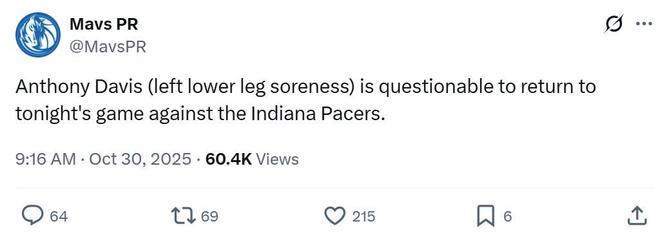 在核心欧文重伤缺阵的情况下,本场比赛浓眉哥又在仅出战6分36秒后伤退,下场时浓眉哥疑似崴脚,同时蹲在场边抚摸小腿许久,由于其患有双侧跟腱劳损,独行侠也不敢让其冒险回归,官方宣布左小腿酸疼缺席本场比赛。